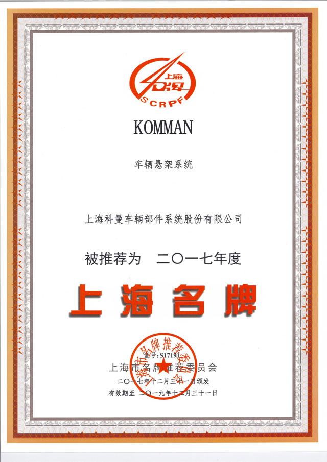 上海科曼车辆部件系统股份有限公司被推荐为2017年度“上海名牌”。有效期自2017年12月31日起至2019 年12月31日止。
